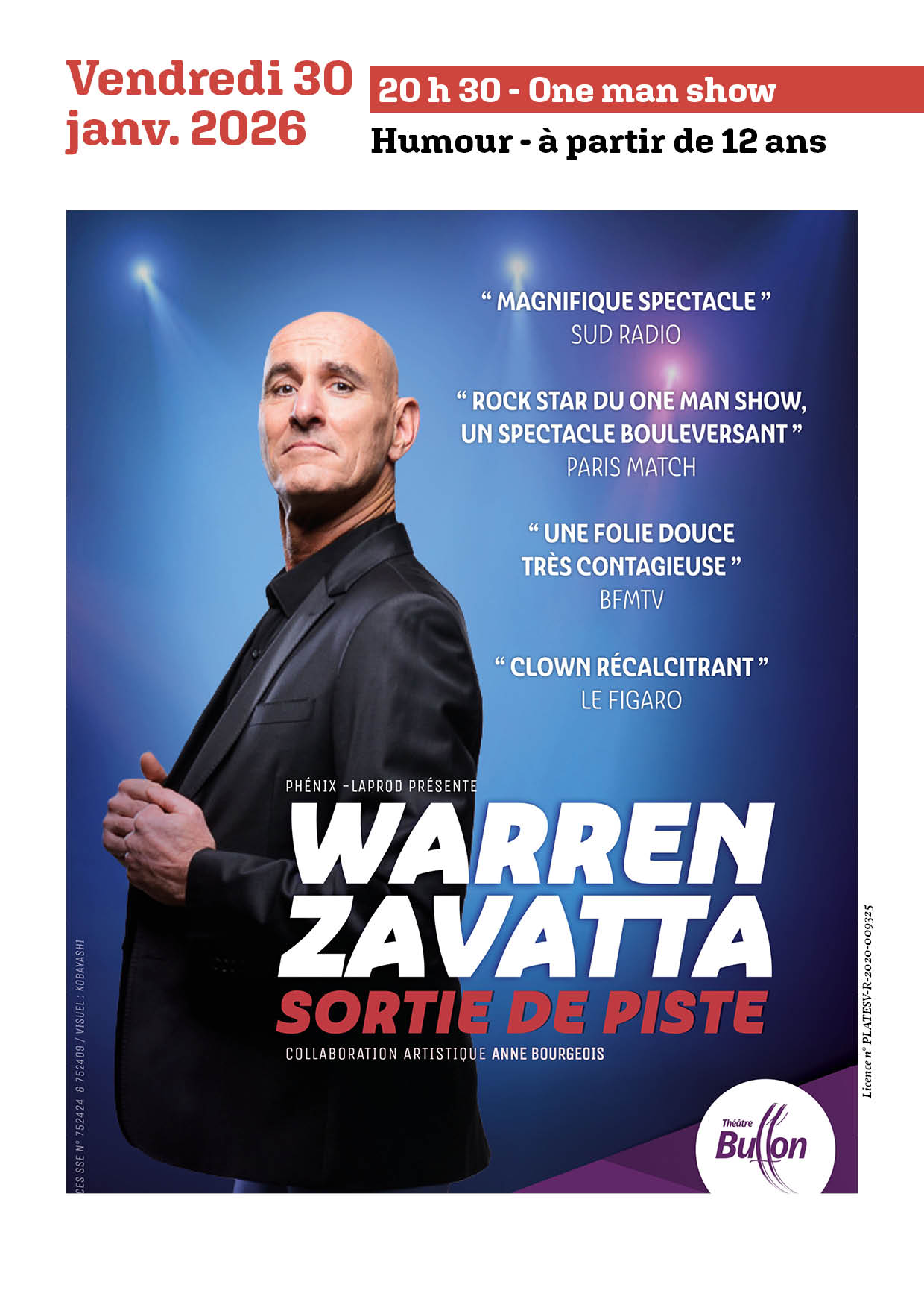 ONE MAN SHOW Vendredi 30 janvier à 20h30 - espace culturel A. de Saint-Exupéry « Et pour finir en beauté, j'ai encastré ma bagnole dans la gendarmerie nationale ! » Warren Zavatta raconte avec humour et dérision le triomphe de son précédent show et ses conséquences sur sa vie personnelle. Sarcastique, potache, parfois surréaliste, il partage ses frasques qui le mènent de l’ovation à la prison, en passant par l’unité psychiatrique. On rit beaucoup, on sourit souvent, et on est touché en découvrant les raisons de ces sorties de piste répétées. « La seule différence entre un fou rire et un rire fou, c‘est la camisole ! » Pour réserver : Warren Zavatta, Sortie de piste | 30 Janvier 2026 |