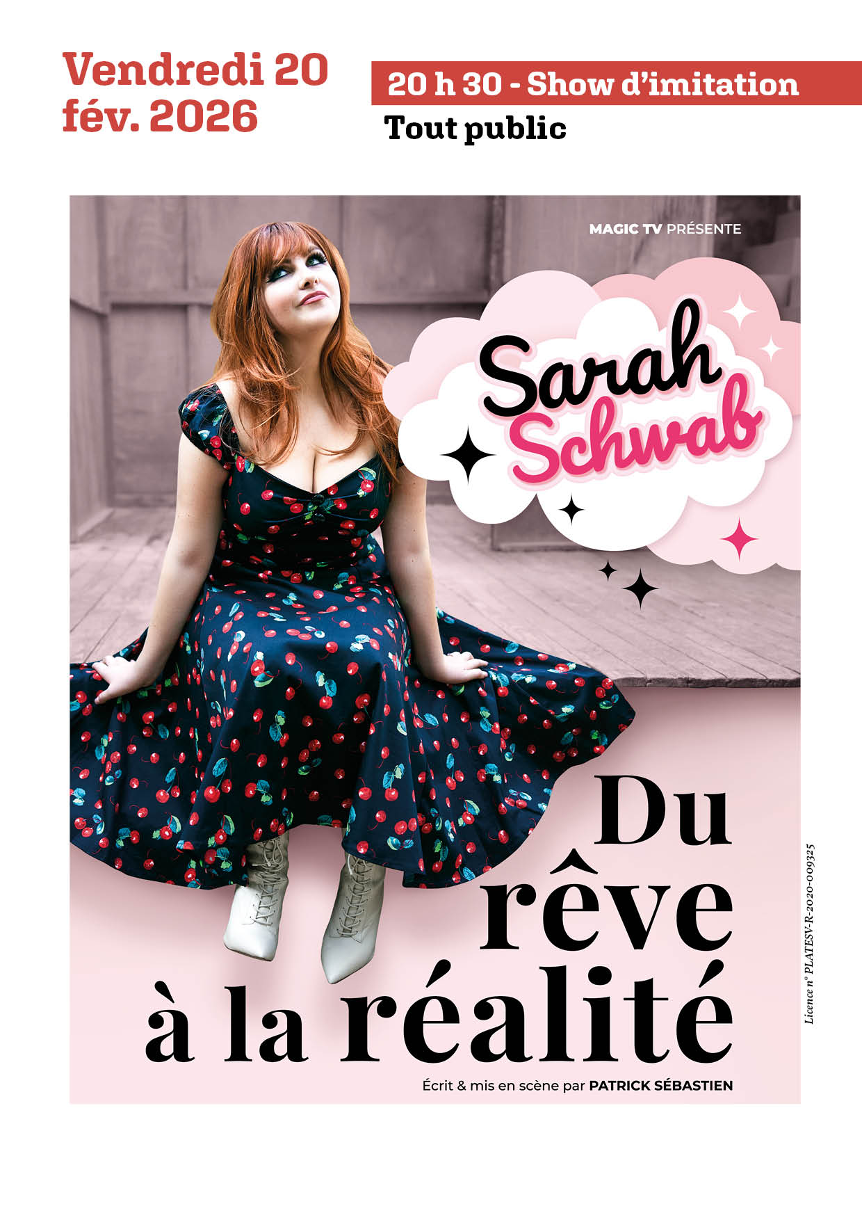 SHOW D'IMITATION Vendredi 20 février à 20h30 - espace culturel A. de Saint-Exupéry Découvrez le spectacle de Sarah Schwab, un show unique d’imitations toutes plus bluffantes les unes que les autres. Pour réserver : Sarah Schwab, du rêve à la réalité | 20 Février 2026 |