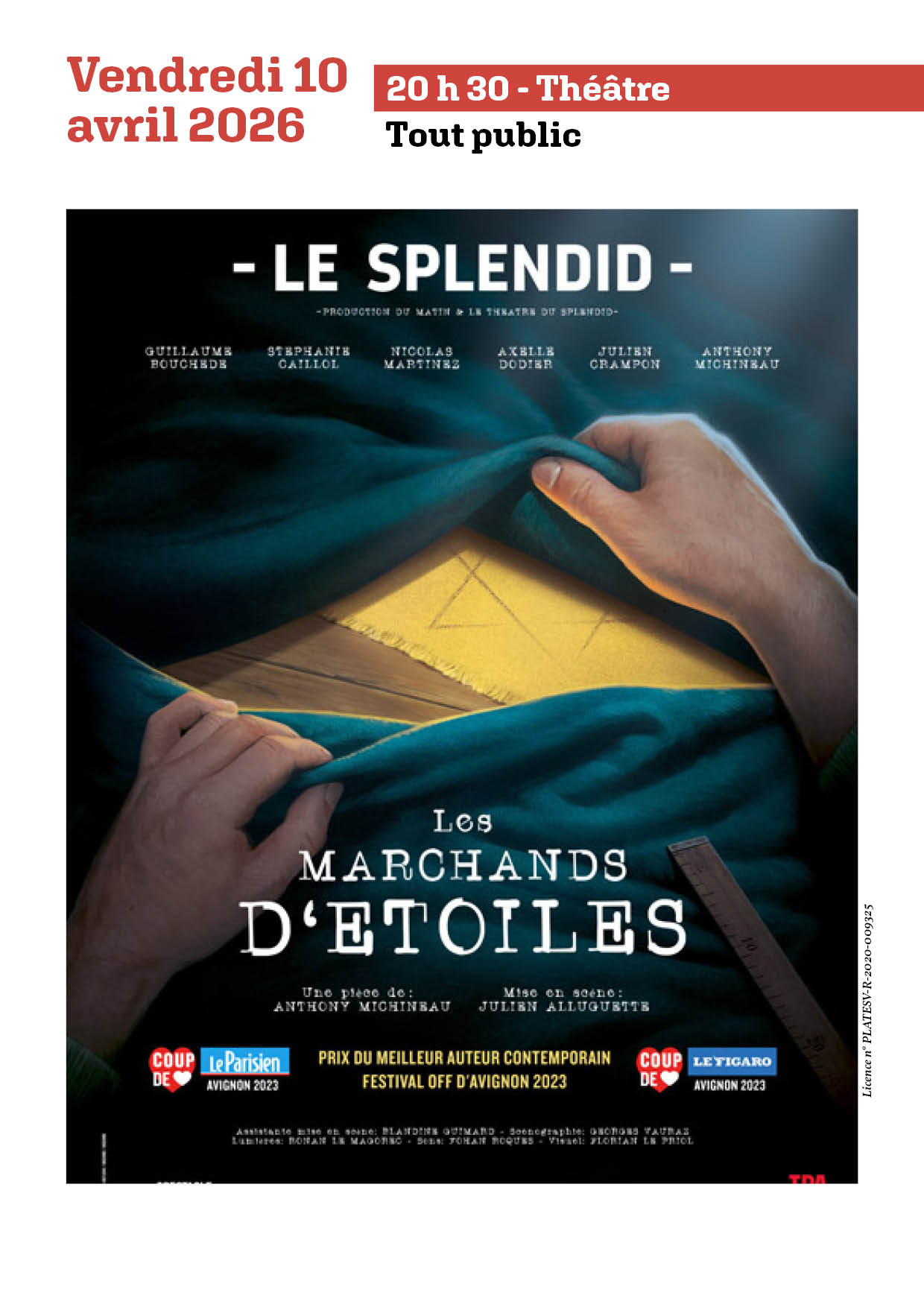 THÉÂTRE Vendredi 10 avril à 20h30 - espace culturel A. de Saint-Exupéry La vie poursuit son cours, dans un dépôt de tissus parisien, en juin 1942. Raymond Martineau, le patron, ne réussit pas imposer son autorité à sa fille. A sa femme non plus, d'ailleurs. Et puis il y a aussi Joseph, son plus jeune employé, dont le père est breton mais dont la mère est juive. Et enfin il y a Louis, son plus vieil employé, dont le nouvel ami est un collabo de la pire espèce. Mais à part ça… La vie poursuit son cours. Une pièce à la fois drôle et émouvante, portée par un casting de rêve: Nicolas Martinez, Guillaume Bouchède, Anthony Michineau, Julien Crampon, Stéphanie Caillol et Axelle Dodier. La pépite théâtrale des festivals off d'Avignon 2023 & 2024. Pour réserver : Les marchands d'étoiles | 10 Avril 2026 |