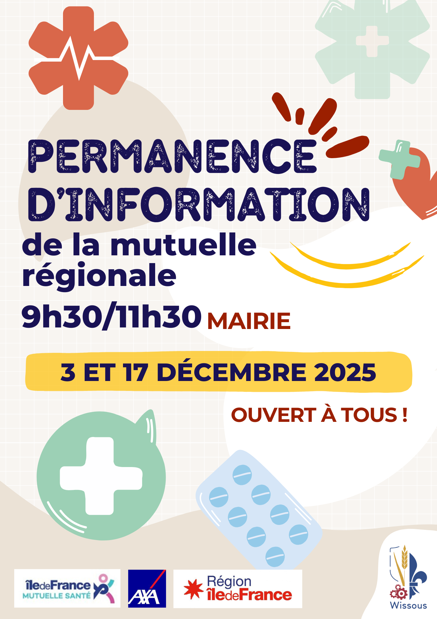 Besoin d’infos sur la mutuelle régionale ?Rendez-vous les mercredis 3 et 17 décembre 2025 de 9h30 à 11h30 à la mairieVenez poser vos questions, découvrir vos droits et comprendre les offres de santé disponibles pour vous et vos proches. C’est gratuit et ouvert à tous ! Avec la participation de Île-de-France Mutuelle Santé, AXA, et la Région Île-de-France. |