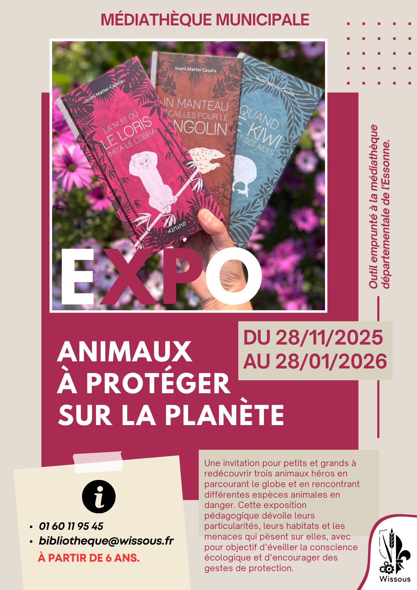 Du 28 novembre 2025 au 28 janvier 2026 à la médiathèque municipaleUne invitation pour petits et grands à découvrir trois espèces animales menacées, leurs habitats et les dangers qui les guettent. Une exposition pédagogique et immersive pour éveiller les consciences et encourager les gestes de protection 🌱 01 60 11 95 45 / bibliotheque@wissous.fr |