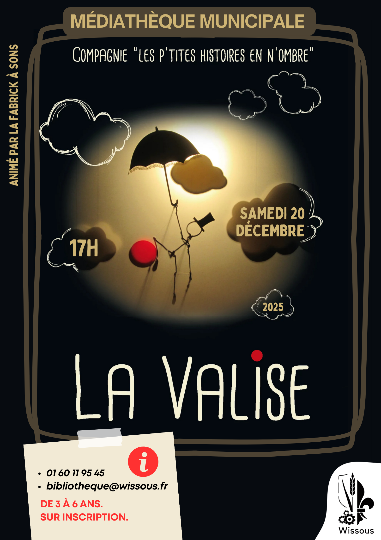 La compagnie « Les p’tites histoires en n’ombre » vous invite à découvrir LA VALISE, un spectacle poétique et tout en ombres, spécialement conçu pour les plus petits. Samedi 20 décembre 2025 - 17h Un moment magique à partager en famille, pour les enfants de 3 à 6 ans. Sur inscription ! 01 60 11 95 45 / bibliotheque@wissous.fr