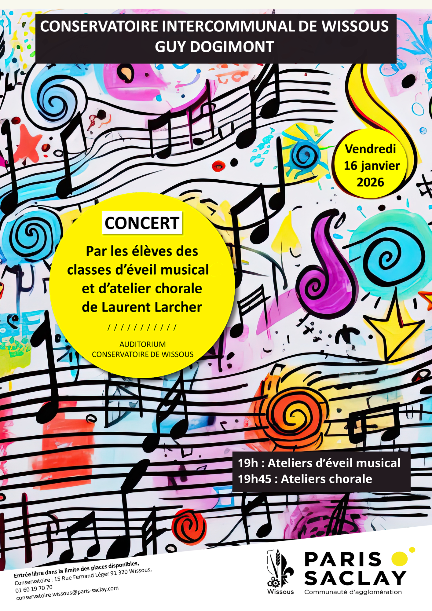 19h45 : Ateliers chorale Concert par les élèves des classes d'éveil musical et d'atelier chorale de Laurent Larcher. 01 60 19 70 70 / conservatoire.wissous@paris-saclay.com |