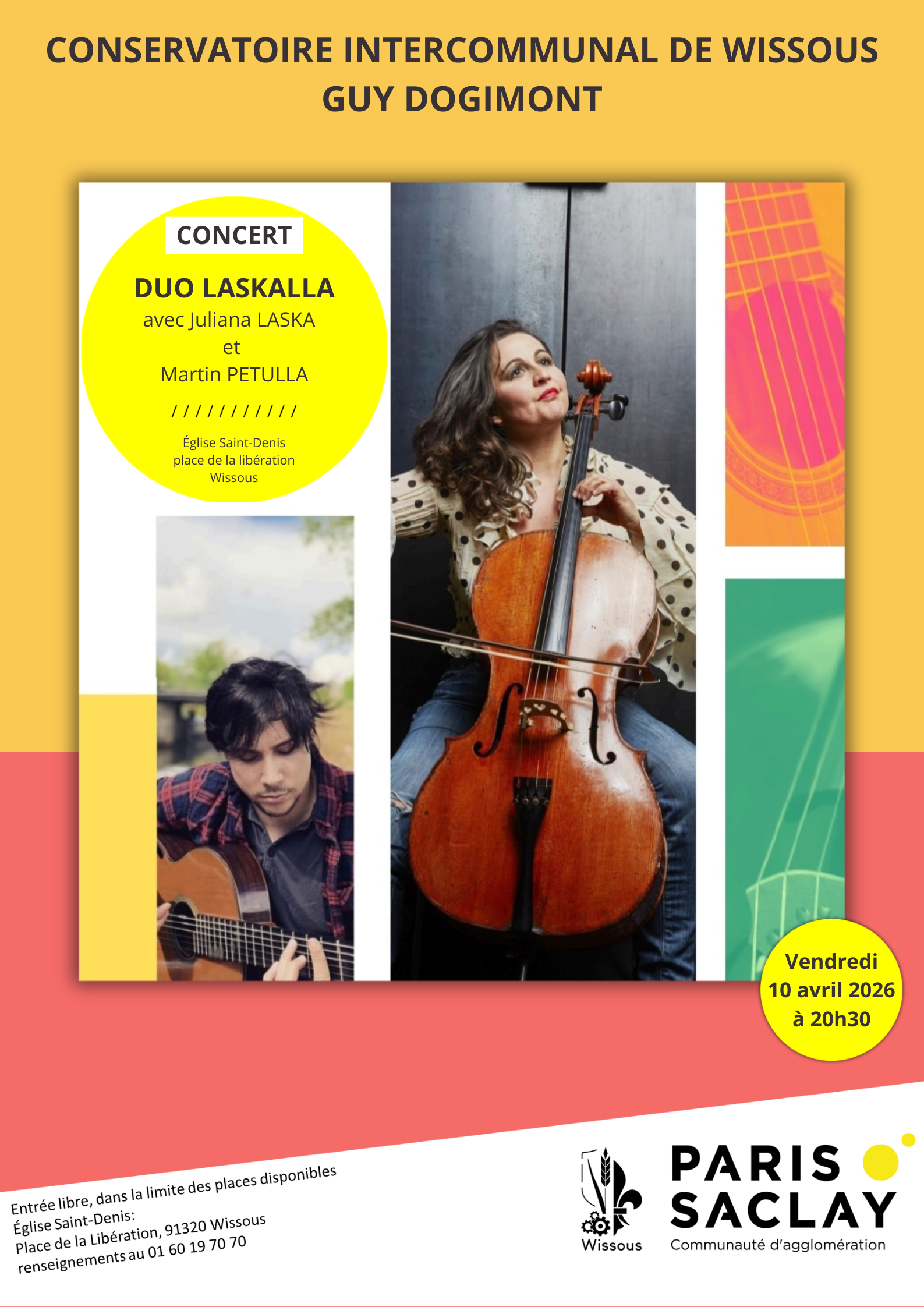 Vendredi 10 avril 2026 à 20h30 à l'église Saint-DenisPar le conservatoire intercommunal de Wissous Guy Dogimont Concert duo Laskalla avec Juliana Laska et Martin Petulla.