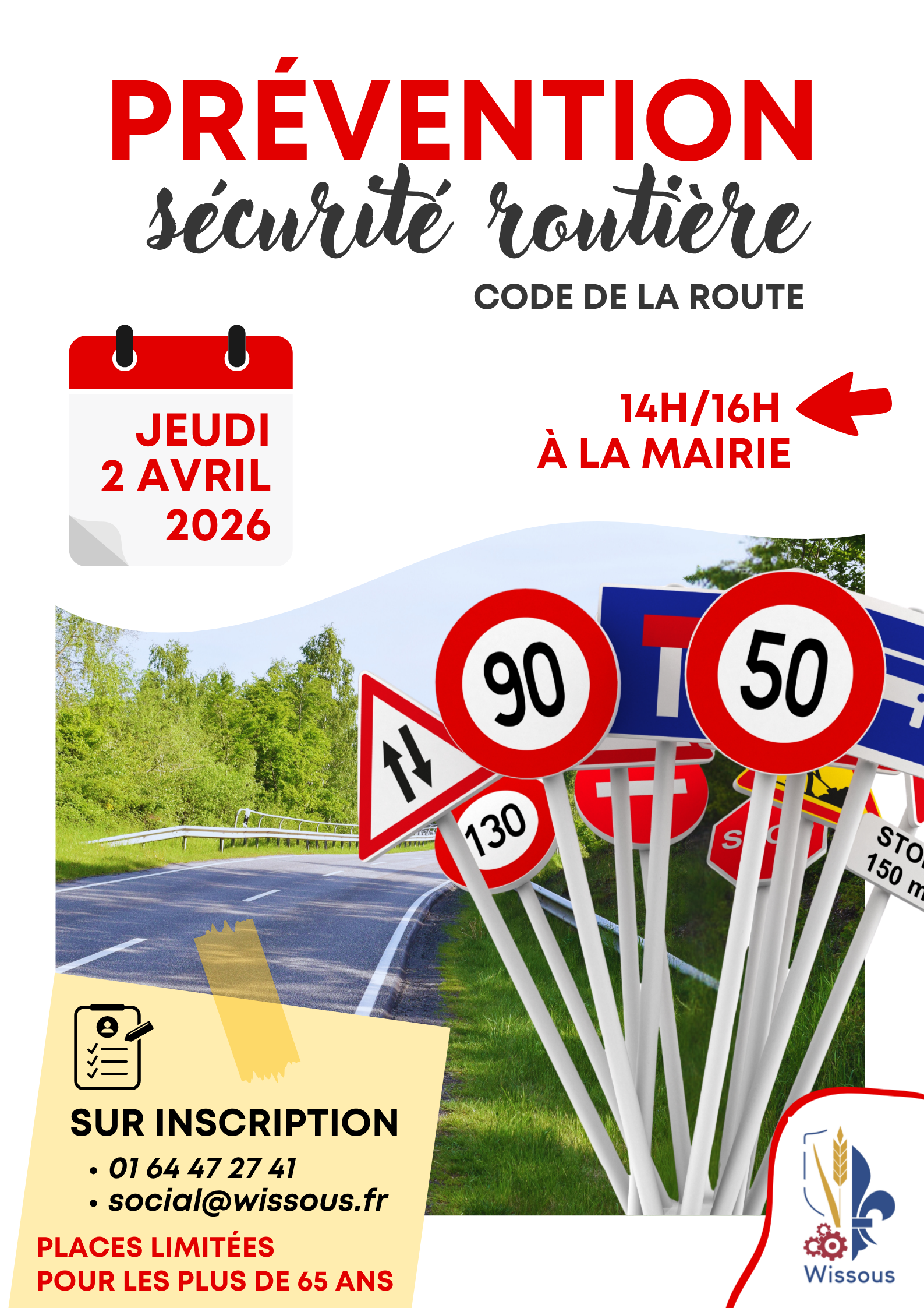 Prévention – Sécurité routière La Ville de Wissous propose une session de sensibilisation autour du Code de la route, spécialement dédiée aux plus de 65 ans. Jeudi 2 avril 2026 Places limitées à 20 participants Sur inscription : 01 64 47 27 41 / social@wissous.fr |