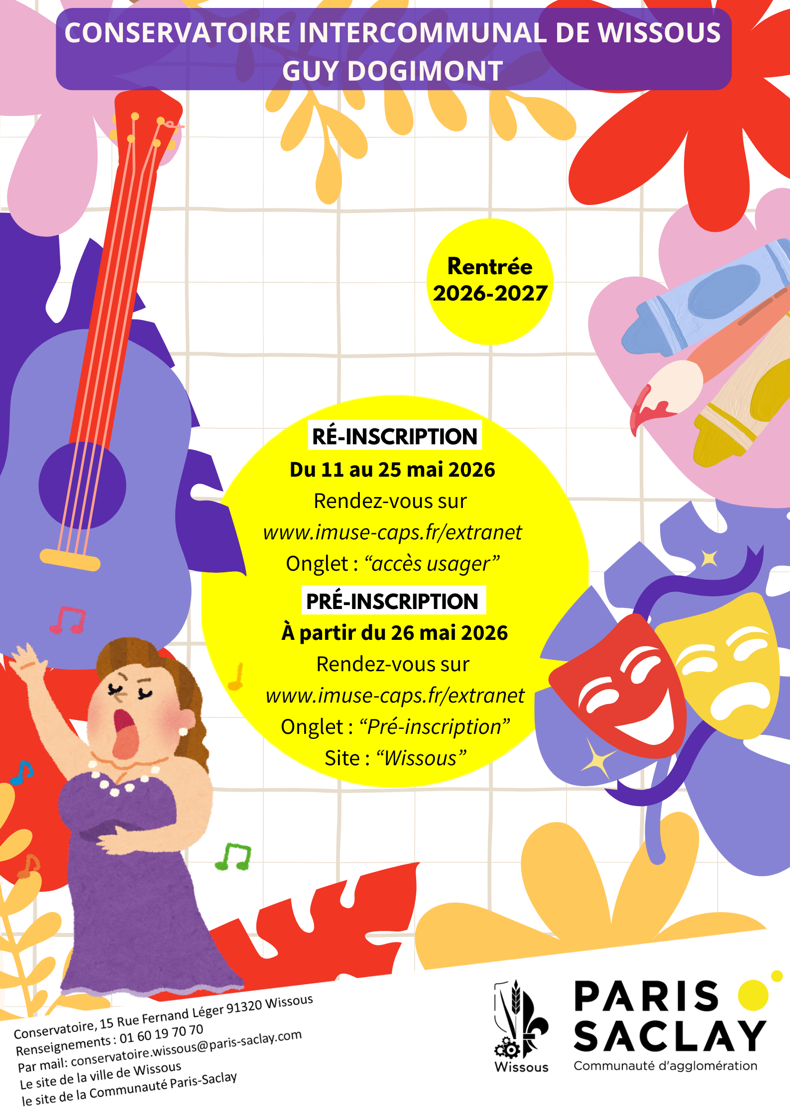 Les pré‑inscriptions débuteront à partir du 26 mai 2026. Elles s’adressent aux nouveaux élèves souhaitant intégrer le conservatoire à la rentrée. La démarche s’effectue en ligne sur le site : www.imuse-caps.fr/extranet - Onglet « Pré‑inscription », en sélectionnant le site « Wissous ».