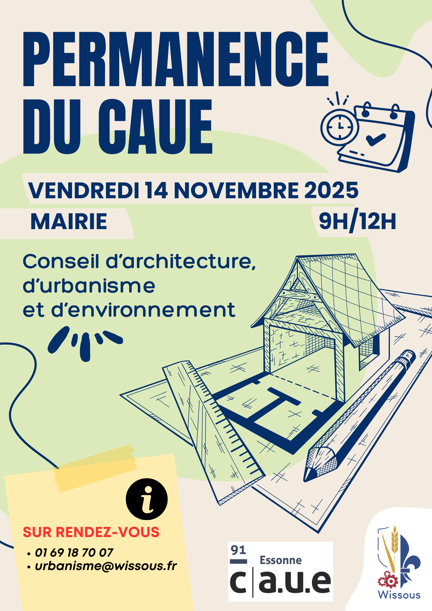 Le vendredi 14 novembre de 9h à 12h, le CAUE vous accueille en mairie pour répondre à vos questions en matière d’architecture, d’urbanisme et d’environnement. Sur rendez-vous auprès du service urbanisme : 01 69 18 70 07 / urbanisme@wissous.fr |
