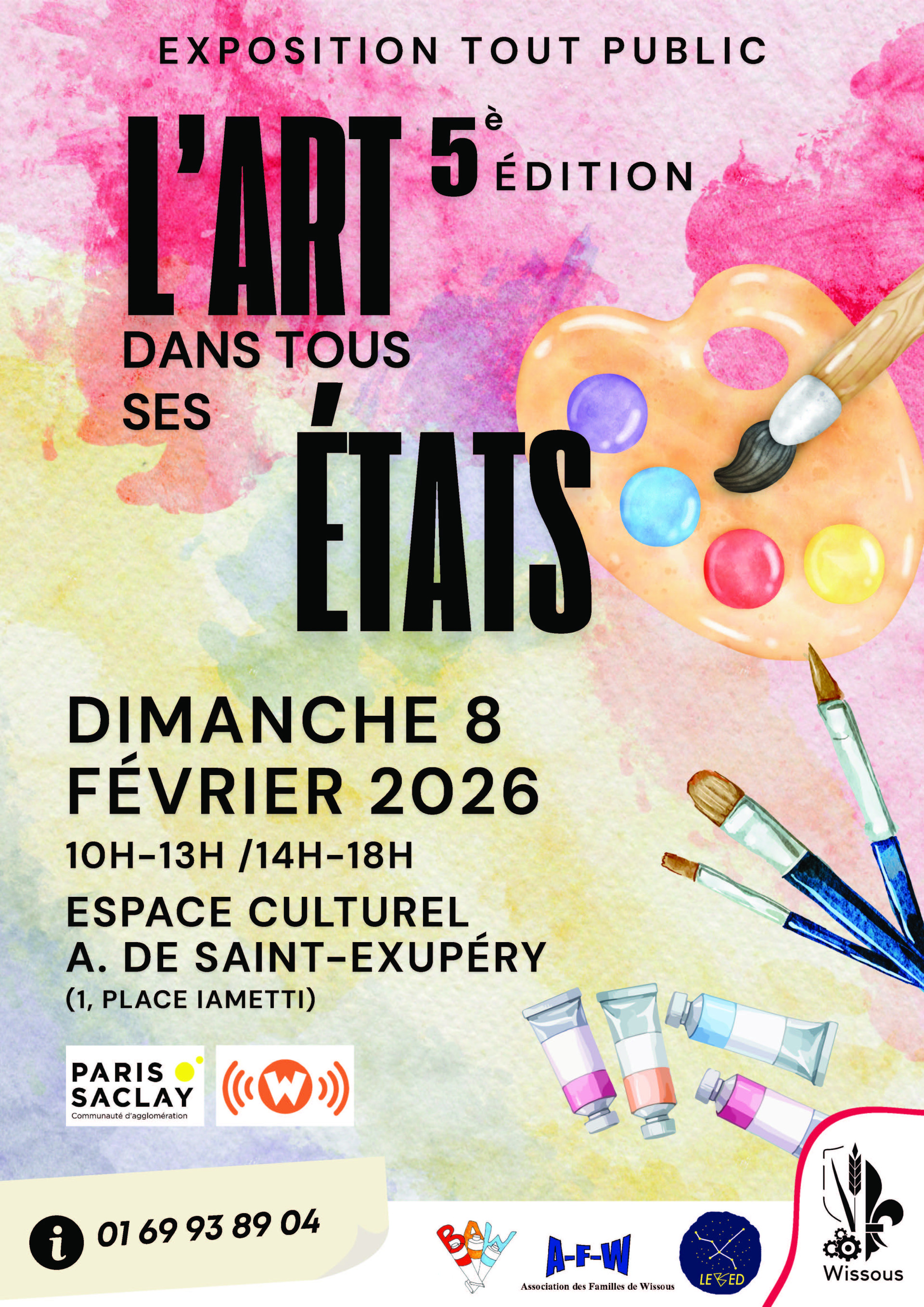 L’Art dans tous ses États – 5e Édition ! Une exposition tout public pour célébrer la créativité sous toutes ses formes ! Venez découvrir des œuvres uniques, rencontrer des artistes passionnés et partager un moment culturel exceptionnel. Entrée libre Organisé avec le soutien de l’agglomération Paris Saclay, des associations AFW, Les Beaux-Arts de Wissous, LEBD, et avec la présence de Radio Wissous. Ne manquez pas ce rendez-vous artistique incontournable ! |